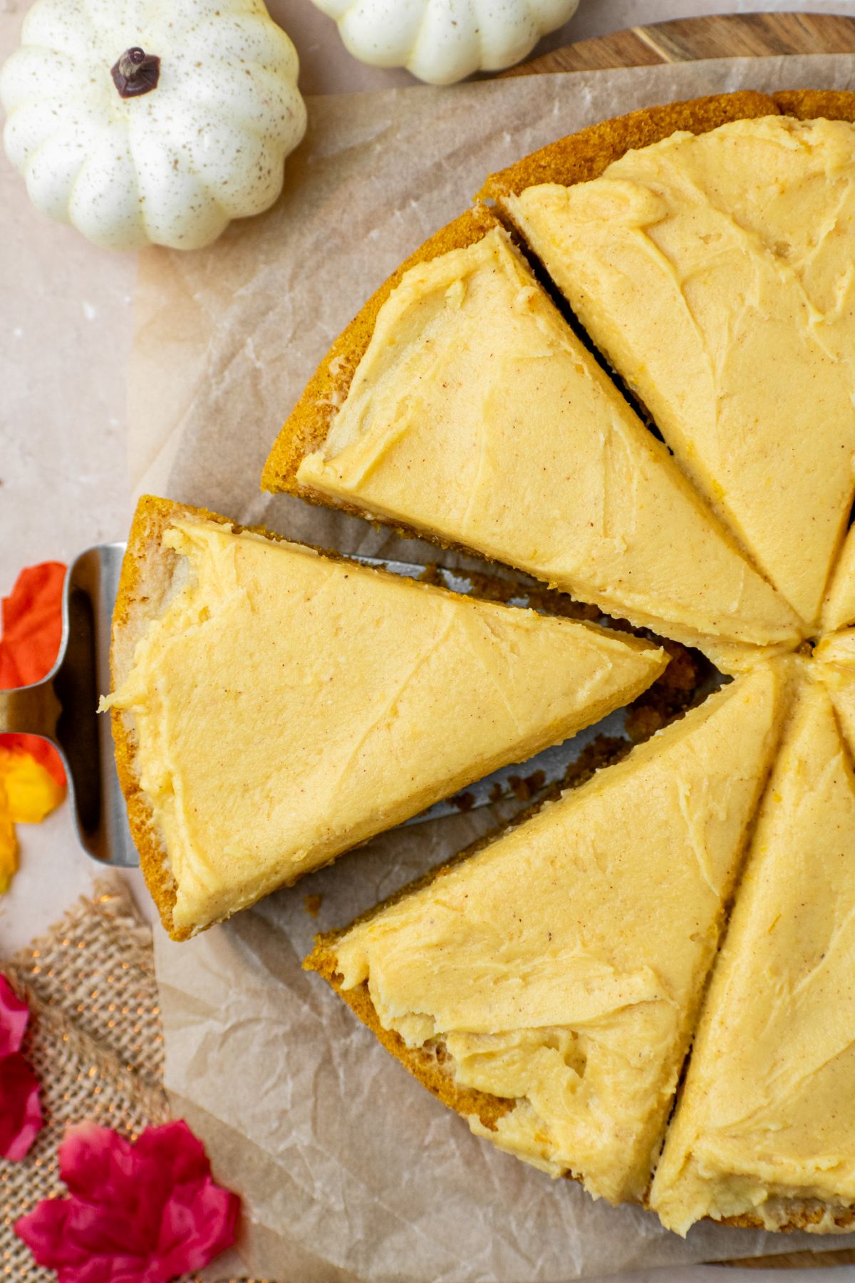- Once the cake has completely cooled, use an offset spatula to spread on the frosting. Feel free to top with extra pumpkin spice seasoning or even sprinkles.