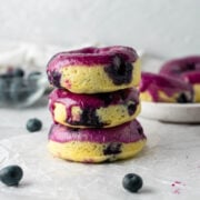 These blueberry baked donuts are soft, fluffy, and are topped witha sweet blueberry glaze. These are cake donuts that are bursting with fresh blueberries with every bite and are ready in just 30 minutes!