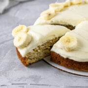 This simple one layer banana cake is soft, moist, and is the most perfect dessert that utilizes your overripe bananas. Topped off with a dreamy cream cheese frosting, you'll love making this one layer cake over and over again!
