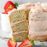 Cake Pans: This recipe calls for three 6-inch cake pans. Line each pan with parchment paper and non-stick spray.Measuring Flour: To help ensure you don’t add extra flour, follow these three simple steps: 1) Fluff up the flour using a fork. 2) Spoon the flour into your measuring cup. 3) Scrape a knife across the top of the measuring cup to level out the flour.Strawberry Puree: This can be made ahead of time if needed.Room Temperature Ingredients: Any ingredient that needs to be at room temperature should be taken out of the refrigerator at least 1 hour before you want to bake. Do not skip this step!Dividing the Batter: To make sure I evenly divide up the batter amongst the cake pans I use a ½ measuring cup to scoop the batter into each pan. I count as I go and then switch to a tablespoon as I get less and less batter.